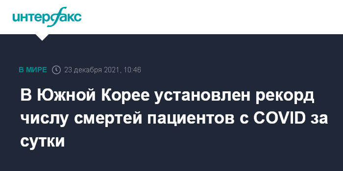 Москва. 23 декабря. INTERFAX.RU - В Южной Корее снижается число ежесуточно выявляемых заражений коронавирусом, однако показатели критических случаев заболевания и смертей среди инфицированных бьют рекорды, передает в четверг агентство "Рёнхап".