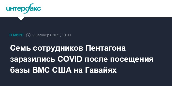 Москва. 23 декабря. INTERFAX.RU - Сразу семь сотрудников Пентагона после посещения базы ВМС США на Гавайских островах сдали положительный тест на коронавирус COVID-19, сообщают в четверг западные СМИ со ссылкой на заявление американского оборонного ведомства.