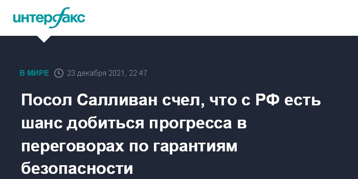 Москва. 23 декабря. INTERFAX.RU - В Вашингтоне полагают, что в переговорах с Москвой по гарантиям безопасности есть шанс добиться прогресса, заявил посол США в РФ Джон Салливан.