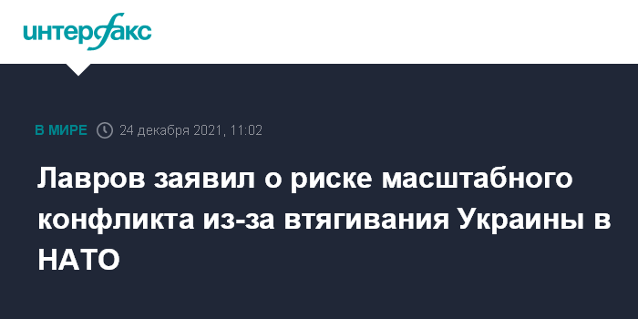 Москва. 24 декабря. INTERFAX.RU - В Москве считают, что перспектива появления у границ России ударных военных комплексов и втягивание Киева в НАТО провоцирует серьезные военные риски, вплоть до масштабного конфликта в Европе, заявил глава МИД РФ Сергей Лавров.