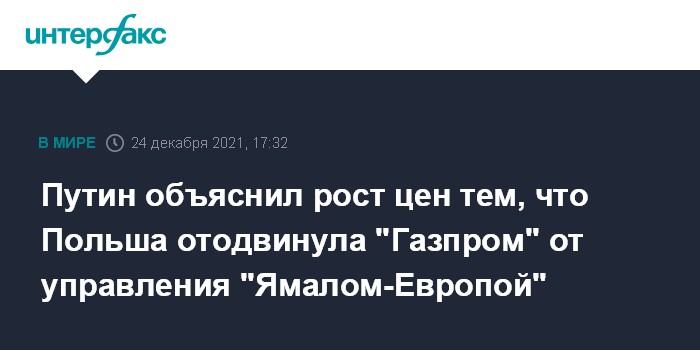 Москва. 24 декабря. INTERFAX.RU - Польская сторона отодвинула Россию от управления газопроводом "Ямал-Европа", что могло привести к нынешним кризисным явлениям на европейском рынке, заявил президент РФ Владимир Путин.