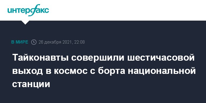 Москва. 26 декабря. INTERFAX.RU - Два китайских тайконавта (космонавта) из состава экипажа создаваемой национальной орбитальной станции "Тяньгун" в воскресенье по московскому времени совершили успешный шестичасовой выход в открытый космос для проведения на ее поверхности монтажных работ, сообщило Управление программы пилотируемых полётов КНР (CMSA).