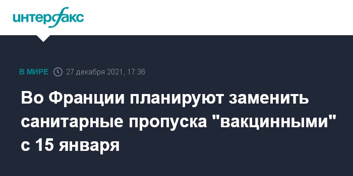 Москва. 27 декабря. INTERFAX.RU - Правительство Франции рассчитывает ввести в действие "вакцинные пропуска" для граждан, начиная с 15 января, сообщил телеканал RTBF со ссылкой на проект закона, представленный в понедельник на Совете министров.