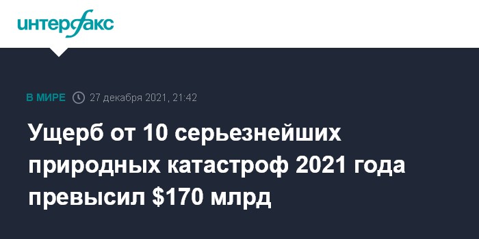 Москва. 27 декабря. INTERFAX.RU - Причинившие наибольший ущерб в мире за 2021 год 10 природных бедствий привели к экономическим потерям на сумму более $170 млрд, сообщает в понедельник издание The Hill со ссылкой на ежегодный доклад благотворительной организации "Христианская помощь".