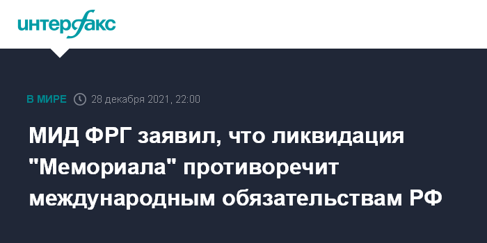 Москва. 28 декабря. INTERFAX.RU - Ликвидация Верховным судом России международного историко-просветительского общества "Мемориал" (признано в РФ НКО-иноагентом) идет вразрез с обязательствами РФ в сфере международного права, приводит позицию МИД Германии во вторник информационный портал RP ONLINE.