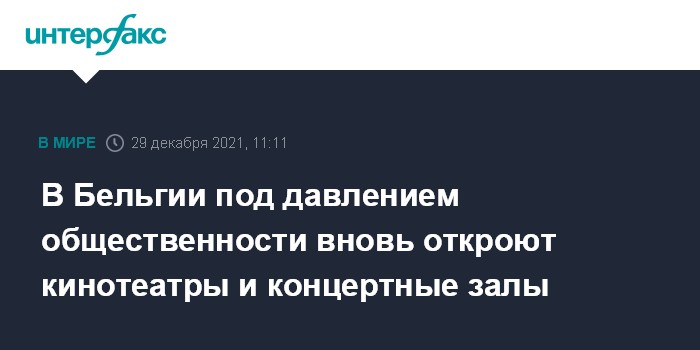 Москва. 29 декабря. INTERFAX.RU - Правительство Бельгии отказалось от части объявленных ранее ограничительных мер в связи с пандемией COVID-19 и накануне вечером решило снять запрет на работу кинотеатров и концертных залов, сообщили в среду бельгийские СМИ.