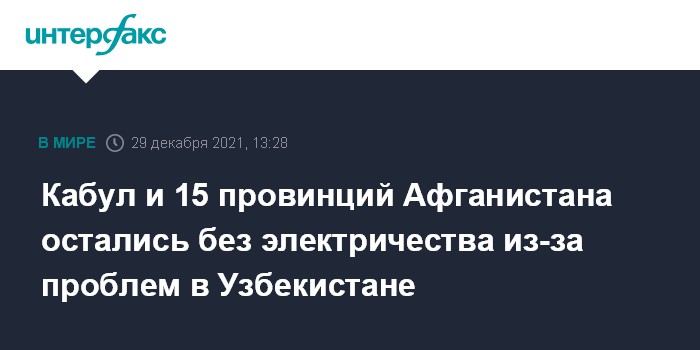 Москва. 29 декабря. INTERFAX.RU - Из-за технических проблем в Узбекистане поставки электроэнергии в Афганистан сократились на 50%, сообщила в среду Национальная электроэнергетическая компания Афганистана Da Afghanistan Breshna Sherkat (DABS).