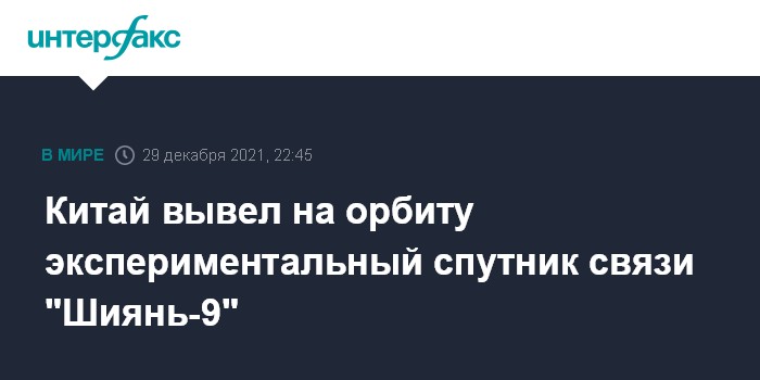 Москва. 29 декабря. INTERFAX.RU - Китай успешно вывел на околоземную орбиту экспериментальный спутник связи "Шиянь-9" в рамках своего последнего орбитального запуска в 2021 году, сообщила в среду Китайская аэрокосмическая научно-техническая корпорация (CASC).