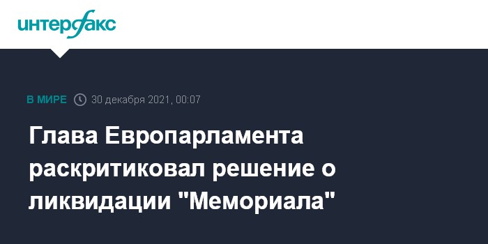 Москва. 30 декабря. INTERFAX.RU - Глава Европарламента Давид Сассоли раскритиковал решение о ликвидации в РФ историко-просветительского общества "Мемориал" (признано в РФ НКО-иноагентом).