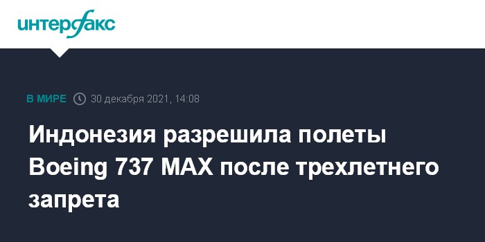 Москва. 30 декабря. INTERFAX.RU - Минтранс Индонезии отменил запрет на полеты самолетов Boeing 737 MAX, введенный три года назад после катастрофы лайнера авиакомпании Lion Air, в которой погибли 189 человек, сообщает BBC.