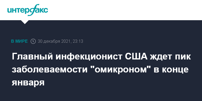 Москва. 30 декабря. INTERFAX.RU - Директор Национального института аллергических и инфекционных заболеваний США доктор Энтони Фаучи заявил, что пиковые показатели заболеваемости вариантом коронавируса "омикрон" в стране, вероятно, будут наблюдаться в конце января, передает CNBC.