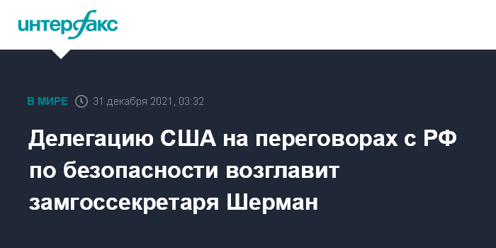 Москва. 31 декабря. INTERFAX.RU - Первый заместитель госсекретаря США Уэнди Шерман будет возглавлять американскую делегацию на переговорах с Россией по гарантиям безопасности, сообщил телеканал CNN со ссылками на несколько источников.