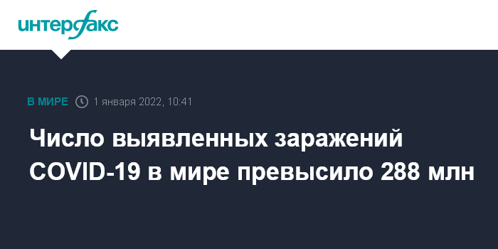 Москва. 1 января. INTERFAX.RU - Число зарегистрированных случаев заражения коронавирусом COVID-19 в мире на утро субботы достигло 288 млн 201 тыс. 551, свидетельствуют данные американского университета Джонса Хопкинса.