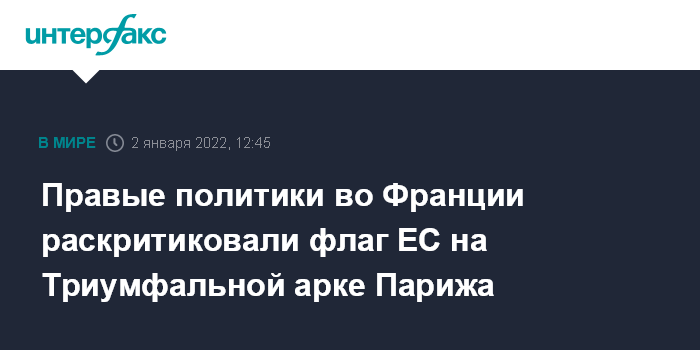 Москва. 2 января. INTERFAX.RU - Вывешенный 31 декабря на парижской Триумфальной арке флаг Евросоюза в ознаменование председательства Франции в Совете ЕС вызвал полемику во французских политических кругах и был снят в ночь на воскресенье.