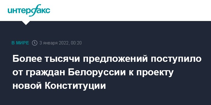 Москва. 3 января. INTERFAX.RU - Директор национального центра правовой информации Белоруссии Андрей Мательский заявил, что к проекту новой Конституции страны поступило более тысячи предложений, 98% из них так или иначе направлены на его поддержку.