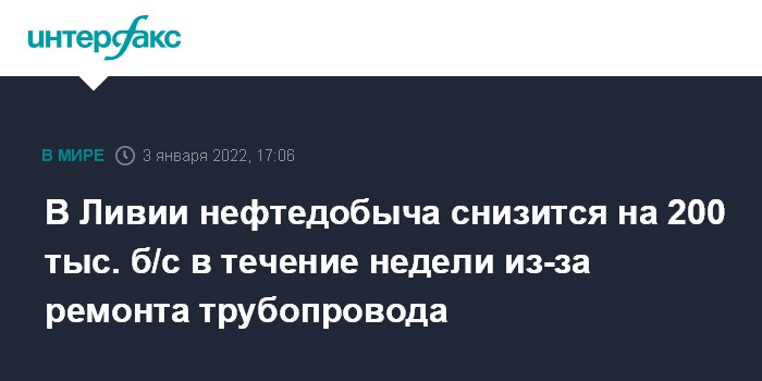 В конце декабря сообщалось, что Ливия остановила производство на четырех нефтяных месторождениях (El-Sharara, El-Feel, Al-Wafa и Hamada fields) и потеряла более 300 тыс. б/с добычи ввиду "перекрытия прокачки нефти отдельными лицами".