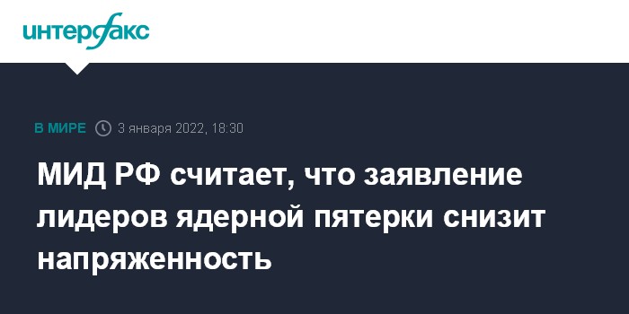 В нем говорится, что Москва приветствует опубликованное 3 января 2022 г. Совместное заявление пяти ядерных держав о предотвращении ядерной войны и недопущении гонки вооружений.