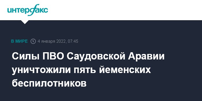 Москва. 4 января. INTERFAX.RU - Система противовоздушной обороны (ПВО) Саудовской Аравии перехватила и уничтожила пять беспилотных летательных аппаратов (БПЛА), запущенных в направлении королевства, говорится во вторник в заявлении арабской коалиции против хуситов.