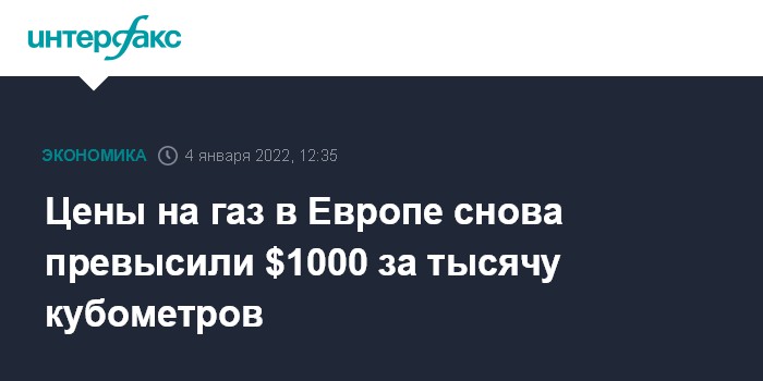Москва. 4 января. INTERFAX.RU - Цена на газ в Европе снова выше $1000 за тысячу кубометров по мере того, как в регионе завершается праздничный марафон, а новогодняя оттепель сменяется более привычными для этого сезона температурами.