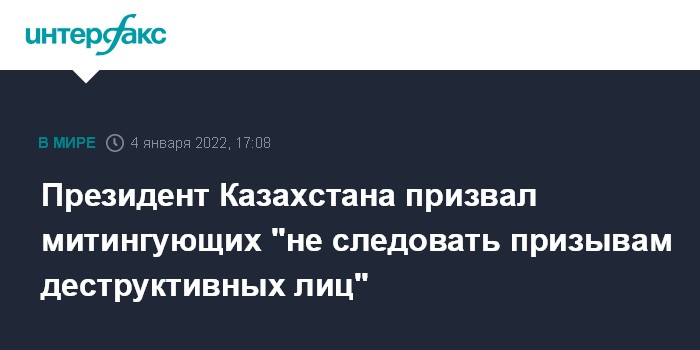 Москва. 4 января. INTERFAX.RU - Президент Казахстана Касым-Жомарт Токаев призвал протестующих в Казахстане не следовать призывам деструктивных лиц, заинтересованных в подрыве стабильности государства.