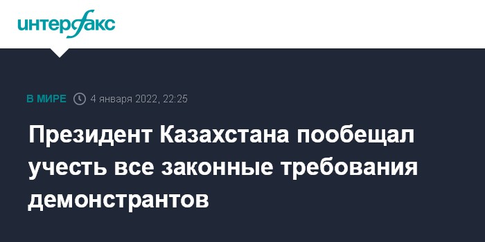 Москва. 4 января. INTERFAX.RU - Президент Казахстана Касым-Жомарт Токаев заявил, что все законные требования демонстрантов будут учтены.