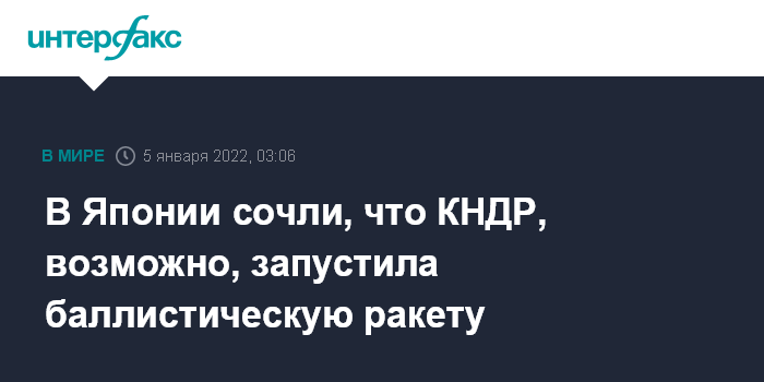 Токио. 5 января. INTERFAX.RU - Северная Корея выпустила, предположительно, баллистическую ракету, сообщают японские СМИ со ссылкой на правительство.