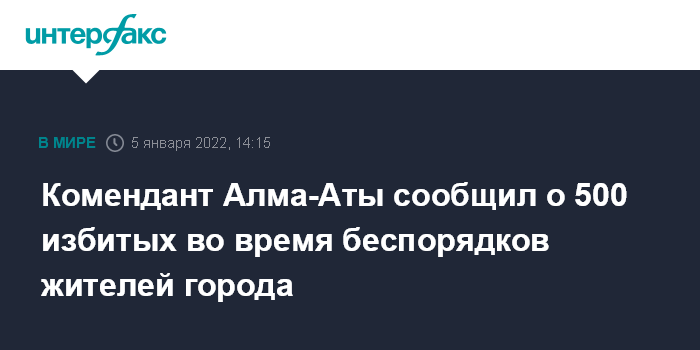 Москва. 5 января. INTERFAX.RU - В Алма-Ате в результате беспорядков избиты более 500 гражданских лиц, сообщил комендант города Канат Таймерденов.