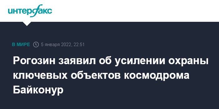 Москва. 5 января. INTERFAX.RU - Глава "Роскосмоса" Дмитрий Рогозин сообщил об усилении ключевых объектов космодрома Байконур на фоне протестов в Казахстане.