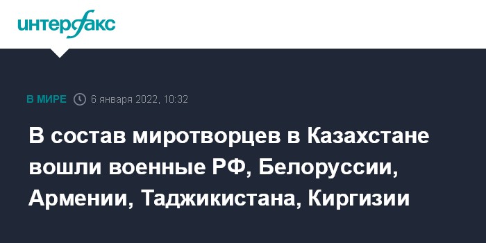 Москва. 6 января. INTERFAX.RU - Военные России, Белоруссии, Армении, Таджикистана и Киргизии вошли в состав миротворческого контингента, который направлен в Казахстан, сообщили в четверг в ОДКБ.