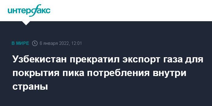 Москва. 6 января. INTERFAX.RU - Узбекистан в настоящее время полностью прекратил экспорт природного газа для покрытия сезонного максимума потребления внутри страны, сообщили "Интерфаксу" в пресс-службе Минэнерго Узбекистана.
