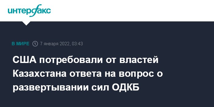 Москва. 7 января. INTERFAX.RU - Госдепартамент США надеется получить от властей Казахстана аргументированный ответ на то, чем была вызвана необходимость ввода в страну миротворческого контингента ОДКБ после сообщений о вмешательстве в события внешних сил.