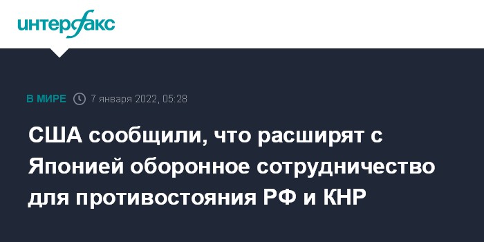 Москва. 7 января. INTERFAX.RU - Соединенные Штаты и Япония подпишут новое соглашение о сотрудничестве в области обороны для противодействия возникающим оборонным угрозам, включая гиперзвуковые и космические возможности, заявил в четверг госсекретарь США Энтони Блинкен.