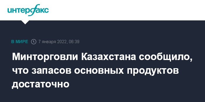 Москва. 7 января. INTERFAX.RU - Запасов продуктов питания в Казахстане достаточно, деятельность торговых сетей, пострадавших от рук мародёров, восстанавливается, сообщила пресс-служба Минторговли.
