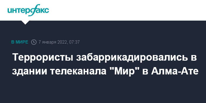"Террористы забаррикадировались в здании телеканала "Мир" на площади Республики в Алматы", - сообщает в эфире госканалов комендатура Алма-Аты.