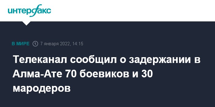 Москва. 7 января. INTERFAX.RU - В Алма-Ате силовики задержали больше 70 боевиков, которые нападали на здания, и больше трех десятков мародеров, сообщил государственный телеканал "Хабар 24" со ссылкой на городской департамент полиции.
