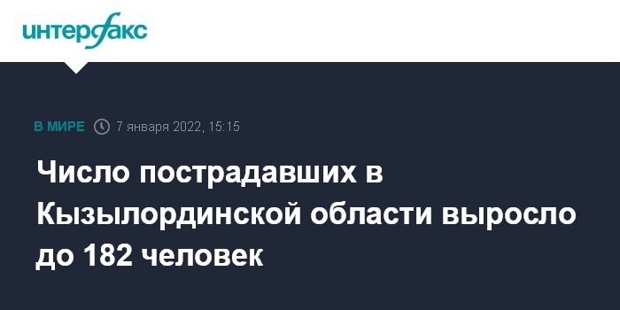 Москва. 7 января. INTERFAX.RU - В Кызылординской области Казахстана за медпомощью обратились 182 человека, пострадавших в ходе беспорядков, госпитализированы 56 человек, 25 из них находятся в реанимации, сообщил телеканал "Хабар 24".