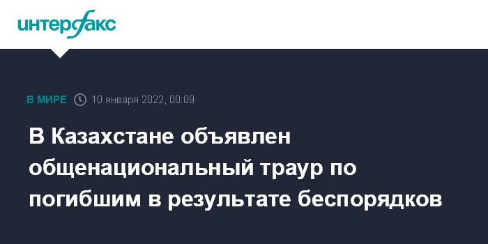 "В связи с гибелью людей в результате совершенных в Республике Казахстан террористических актов объявить 10 января 2022 года общенациональный траур в Республике Казахстан", - говорится в тексте указа, подписанного главой государства Касым-Жомартом Токаевым в субботу, 8 января.