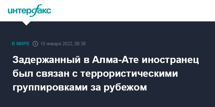 Москва. 10 января. INTERFAX.RU - Задержанный в Алма-Ате лидер одной из экстремистских групп является иностранным гражданином. Также он имел связь с радикалами за рубежом, сообщила пресс-служба Комитета нацбезопасности.