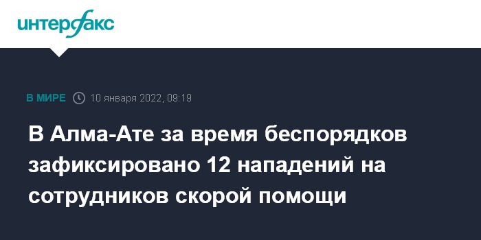 Москва. 10 января. INTERFAX.RU - В Алма-Ате во время беспорядков произошло 12 нападений на сотрудников скорой медицинской помощи, повреждены 32 машины, сообщили в городском штабе по восстановлению жизнеобеспечения.