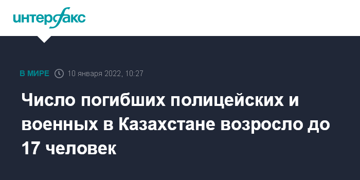 Москва. 10 января. INTERFAX.RU - Число погибших сотрудников силовых структур в Казахстане возросло до 17, сообщили агентству "Интерфакс" в пресс-службе МВД республики.
