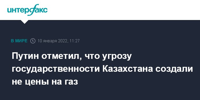 "Мы понимаем, что возникшая угроза казахстанской государственности вызвана отнюдь не стихийными протестными акциями по поводу цен на топливо, а тем, что ситуацией воспользовались деструктивные внутренние внешние силы. Те люди, которые выступали (по поводу) ситуации на газовом рынке – это одни люди, и у них одни цели, а у тех, кто взял в руки оружие, нападал на государство, это – совершенно другие люди, и у них другие цели", - заявил Путин, выступая на сессии Совета коллективной безопасности ОДКБ.