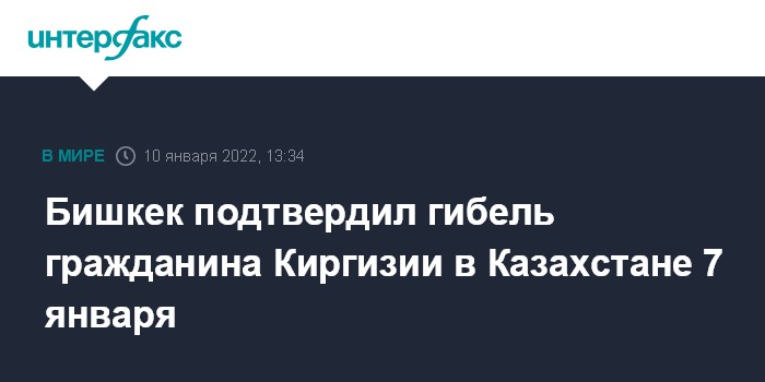 Москва. 10 января. INTERFAX.RU - В Алма-Ате 7 января погиб гражданин Киргизии 1989 года рождения, эту информацию подтвердил и распространил киргизский МИД. Там добавили, что в Казахстане ведется расследование его гибели.