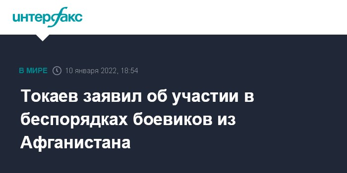 Москва. 10 января. INTERFAX.RU - В акте агрессии против Казахстана участвовали боевики из других стран Центральной Азии, в том числе Афганистан, и с ближнего Востока, заявил президент Казахстана Касым-Жомарт Токаев президенту Европейского совета Шарлю Мишелю. Слова Токаева приводит его пресс-служба.
