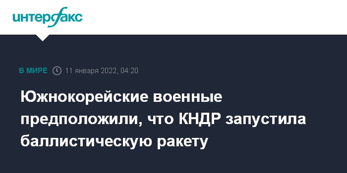 Москва. 11 января. INTERFAX.RU - Северная Корея запустила, предположительно, баллистическую ракету в сторону Японского моря во вторник, сообщает Yonhap со ссылкой на военных Южной Кореи.