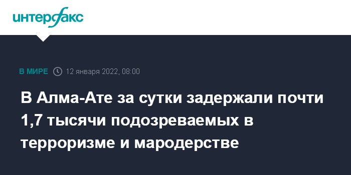 Москва. 12 января. INTERFAX.RU - В Алма-Ате за минувшие сутки задержано 1678 человек, участвовавших в террористических атаках, мародерстве и других преступлениях, сообщил во вторник информационный центр комендатуры города.