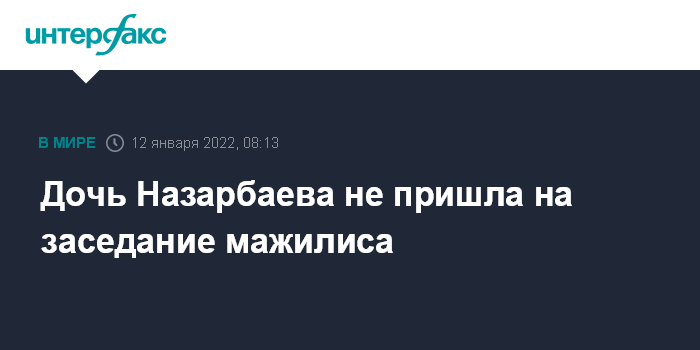 Москва. 12 января. INTERFAX.RU - Депутат мажилиса парламента Казахстана Дарига Назарбаева, дочь первого президента страны, не участвует в пленарном заседании палаты из-за болезни, сообщили "Интерфаксу" в мажилисе.
