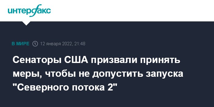 Москва. 12 января. INTERFAX.RU - Сенаторы-демократы США в законопроекте, предусматривающем санкции против РФ в случае нападения на Украину, призывают принять меры, чтобы "Северный поток 2" никогда не начал работу.