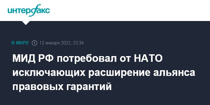 МИД РФ также подчеркивает, что "в целях преломления этой негативной тенденции и снижения военнополитической напряженности в отношениях Россия-НАТО" российская делегация потребовала от альянса "предоставление твердых правовых гарантий, исключающих дальнейшее расширение НАТО и размещение ударных систем вооружений в сопредельных с Россией странах".