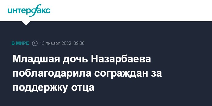 Москва. 13 января. INTERFAX.RU - Младшая дочь первого президента Казахстана, лидера нации Нурсултана Назарбаева Алия Назарбаева поблагодарила сограждан за моральную поддержку отца, который, по ее словам, в эти дни получает от них много сообщений.
