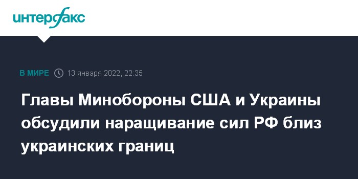 Москва. 13 января. INTERFAX.RU - Глава Пентагона Ллойд Остин провел переговоры с министром обороны Украины Алексеем Резниковым и обсудил с ним наращивание Россией сил близ российско-украинской границы, говорится в заявлении Пентагона.